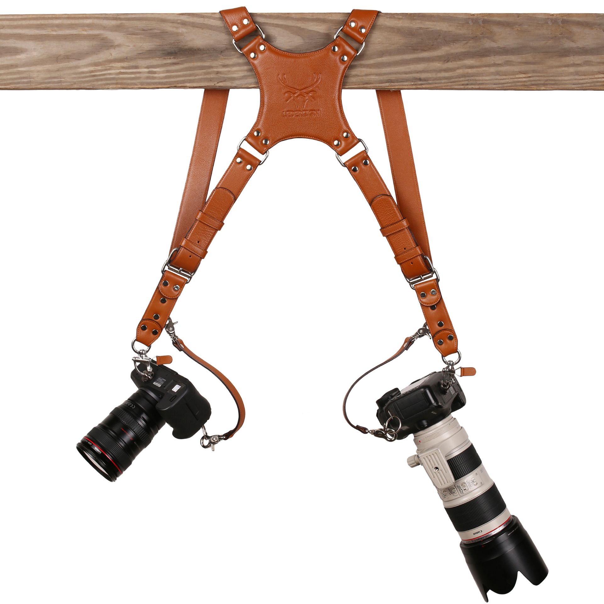 Description DUAL CAMERAS STRAP BY LEDEREiGN This Dual Cameras Harness is completely handmade and is originally designed. It is suitable for everything, all day weddings and studio shoots, travel and wildlife photography and sporting events. The Camera Harness is made of Premium Italian Full Grain Leather and holds two cameras comfortably. The straps of the harness lie in an "X" pattern across your back for added support. The Crab Hook mechanism allows the camera to quick release when needed and also slide along the harness to eye level easily. Suitable for both male and female Lead and chrome free metal hardware used. To secure your gear to the harness, the system includes two Camera D-Rings Accessories that screw into each camera or lens. To keep camera safe make sure to hook extra security straps to your camera Adjustable size