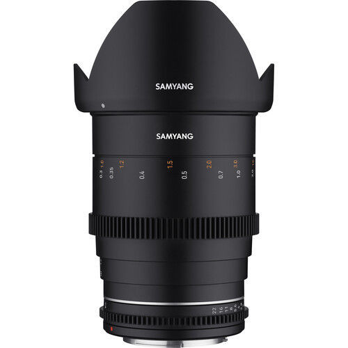 Update your cinema lens set with this 35mm T1.5 VDSLR MK2 Cine Lens from Samyang that comes in a Canon EF mount. The VDSLR MK2 continues the line with the same multilayer coating process, industry-standard geared focus and iris rings, and fast T1.5 aperture, and it adds a 9-blade iris for beautiful soft bokeh, weather sealing to keep the moisture out, and focal lengths on both sides for added versatility for focus pullers.This 35mm lens produces a 63.1° coverage when used with full-frame cameras. Aspherical lenses render sharply defined images with a minimum of distortion and chromatic aberrations, with a minimum focus distance of just under 1' from the lens. The 9-blade iris also allows you to create up to a stunning 18-ray starburst when you're stopped all the way down.A removable petal-shaped lens hood provides flare protection when shooting without a matte box, and the lens' threaded front accepts a 77mm filter ring.