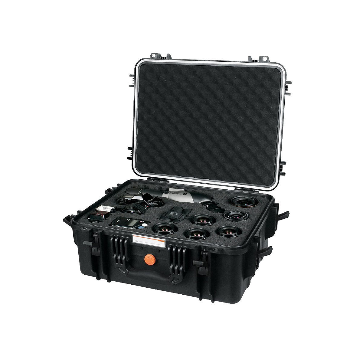 The Vanguard USA Supreme 46F Carrying Case (Black) is a virtually indestructible, engineered hard polypropylene case that is airtight and built to withstand the most extreme conditions. The O-ring sealed case is waterproof to a depth of 16.5' (5m). It has a three-piece foam set with a recessed area inside the case for the top foam and an automatic pressure equalization valve. There are six thick, quick release, easy-open latches that lock in place, and steel-reinforced lock holders to use with padlocks for added security. The case is carried by a cushioned handle and has anti-slip rubber feet.